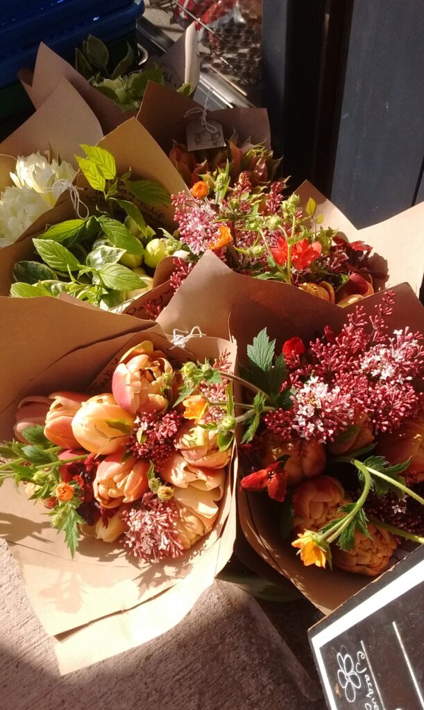 Later Tulips ‘Menton’ and the viridifloras ‘Spring Green’ , ‘Greenland’ and extraordinary ‘Green Wave’ allowed me to create some more stunning Bouquets , including the Geums and , two of my Spring favourites , the prettiest blossom-like flowers of White Honesty , followed by the same and subtle-scent of White Sweet Rocket , with early foliage of Forsythia !