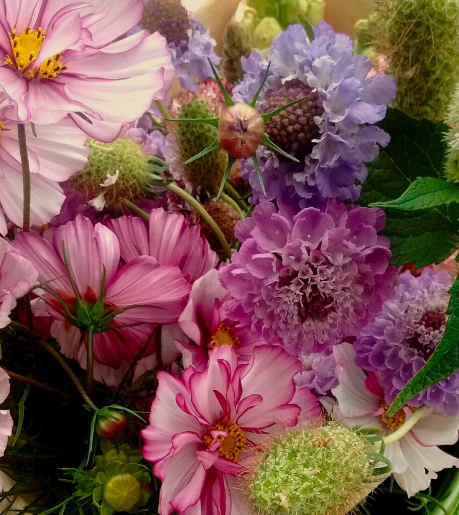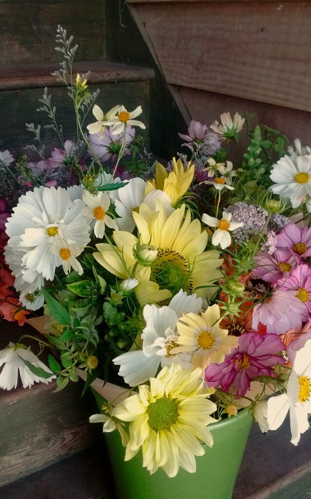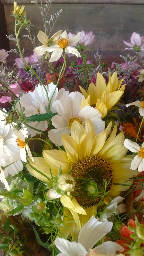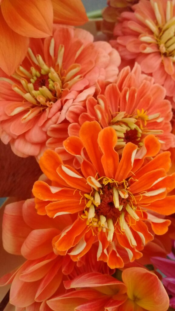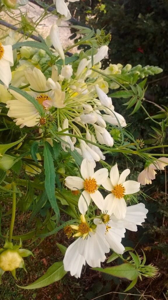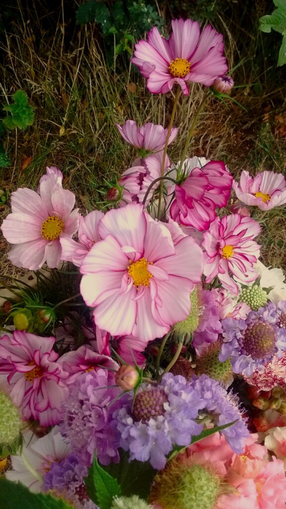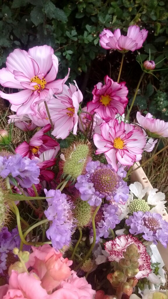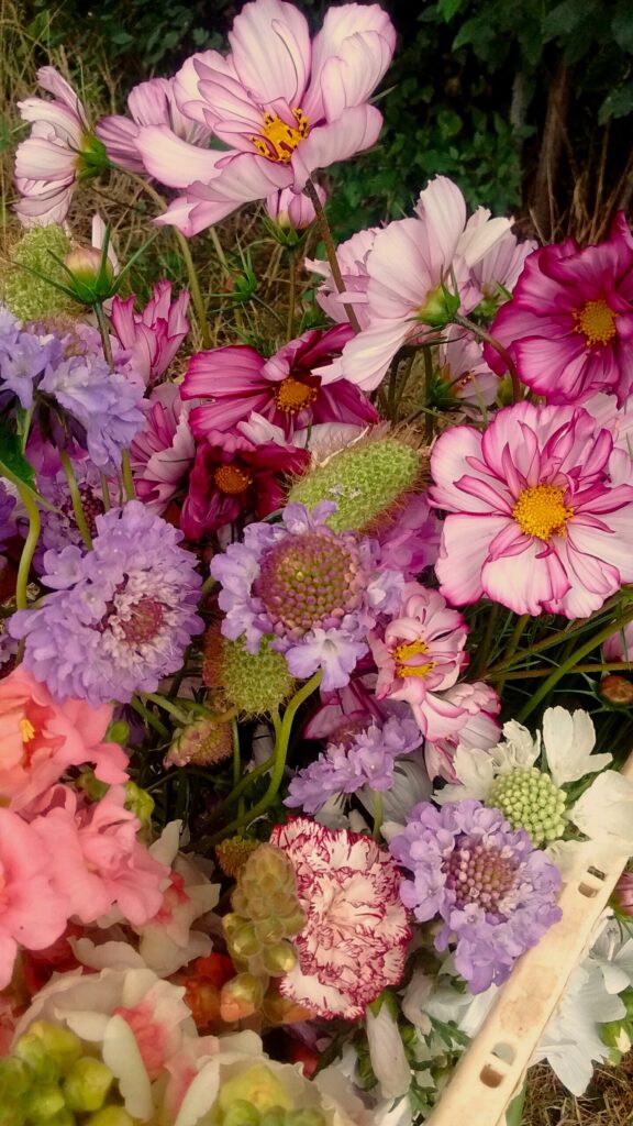 Phew ! So far , August has been burning bright with beautiful blooms of Cosmos , Dahlias and Sunflowers , accompanied by delicate but strong Bidens , jewels of Scabious and my ever present Snaps (Antirrhinums). Plus , the amazing Flowers of Zinnia ‘Super Yoga Salmon Rose’ , adding to the wow factor !