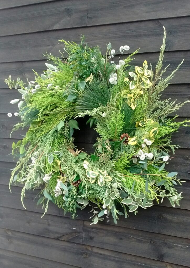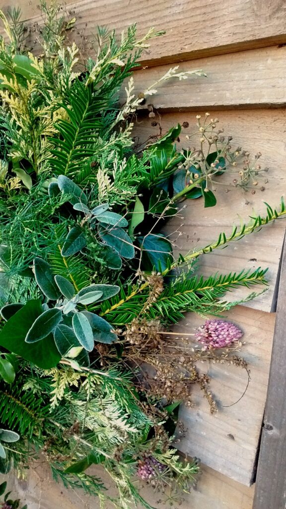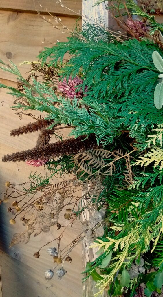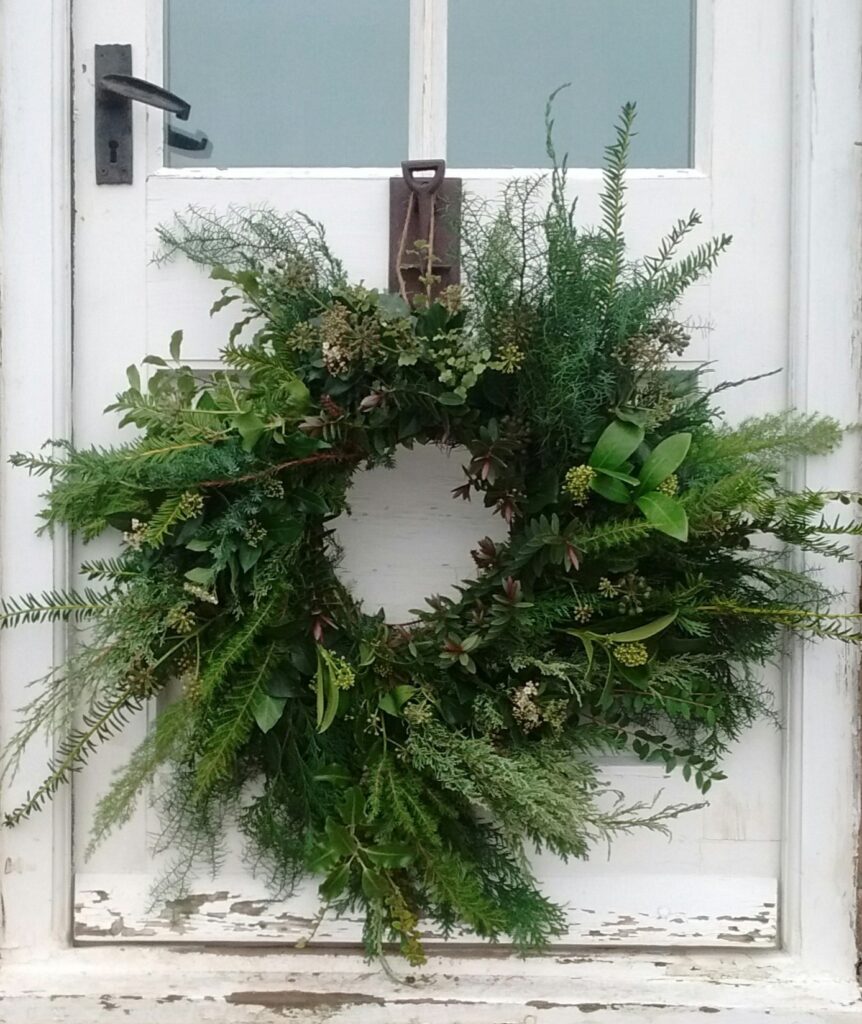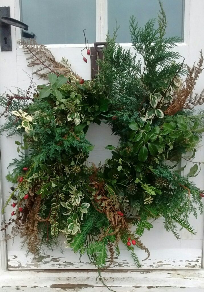 My Wreaths are fully sustainable and bio-degradable , using a willow base , straw and jute ; no moss , no wire. I will be using evergreens foraged from Friends’ Gardens plus foliage , seed-heads , dried-flowers and other structural and seasonal delights that I have grown at Havenhills Farm in Shropshire.
