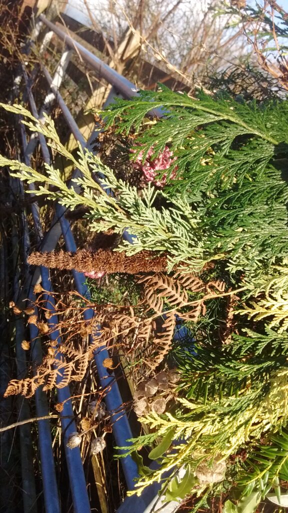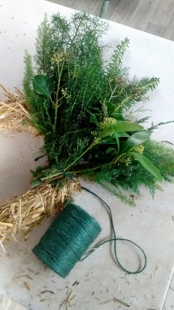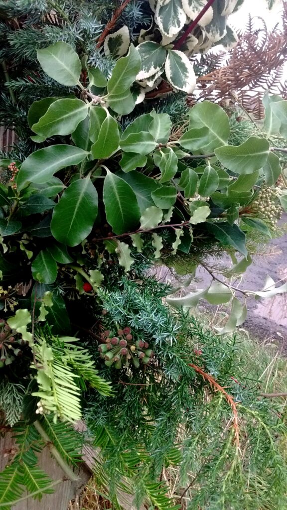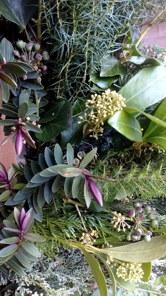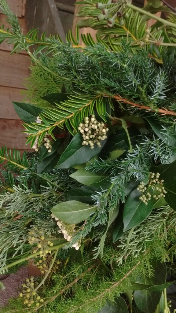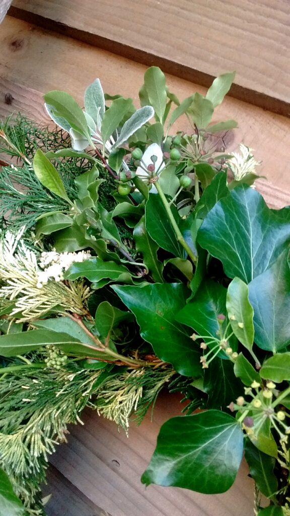 My Wreaths are fully sustainable and bio-degradable , using a willow base , straw and jute ; no moss , no wire. I will be using evergreens foraged from Friends’ Gardens plus foliage , seed-heads , dried-flowers and other structural and seasonal delights that I have grown at Havenhills Farm in Shropshire.
