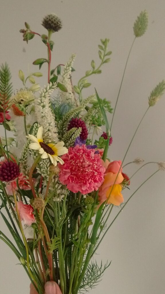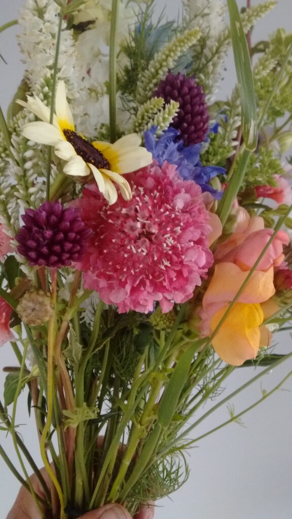 So many glorious Stems in July ; I was able to create with my fabulous Allium sphaerocephalon and Scabious plus Flax , Galega , Grasses and Oregano to add that lovely airiness and natural feel to Bouquets.
