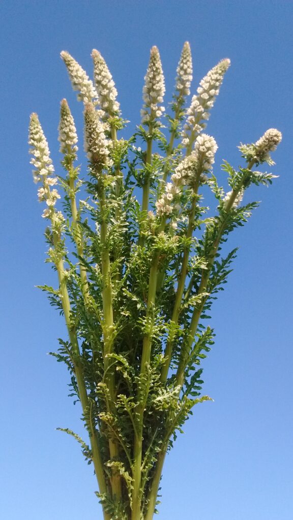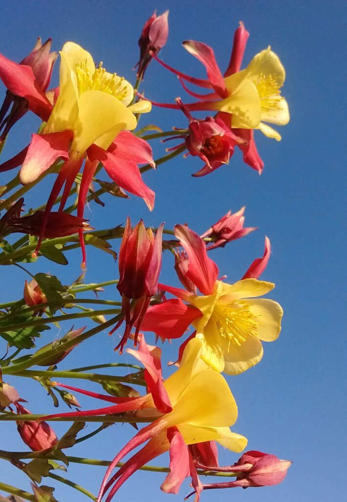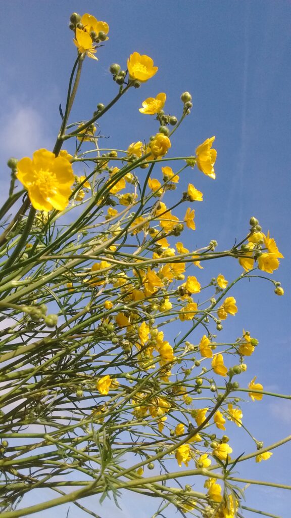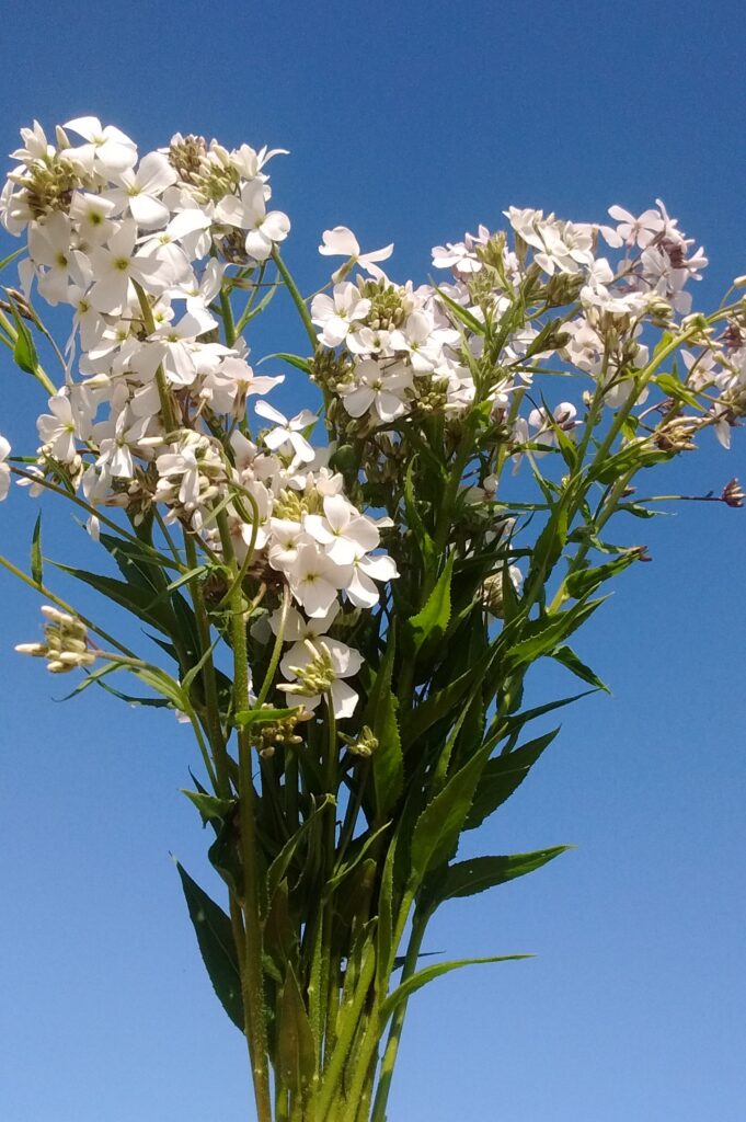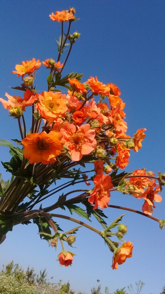 May Meadow perennials , featuring Aquilegias , Buttercups , Geums , Sweet Rocket and White Mignonette (that sky !) …